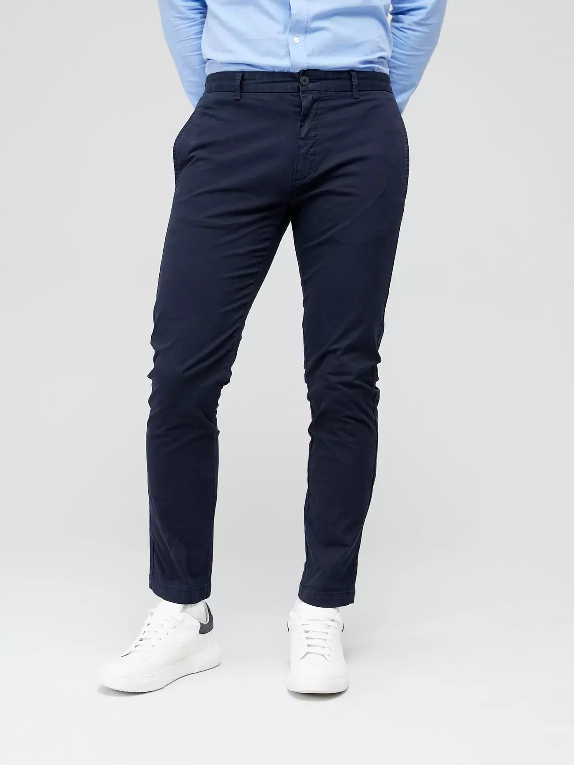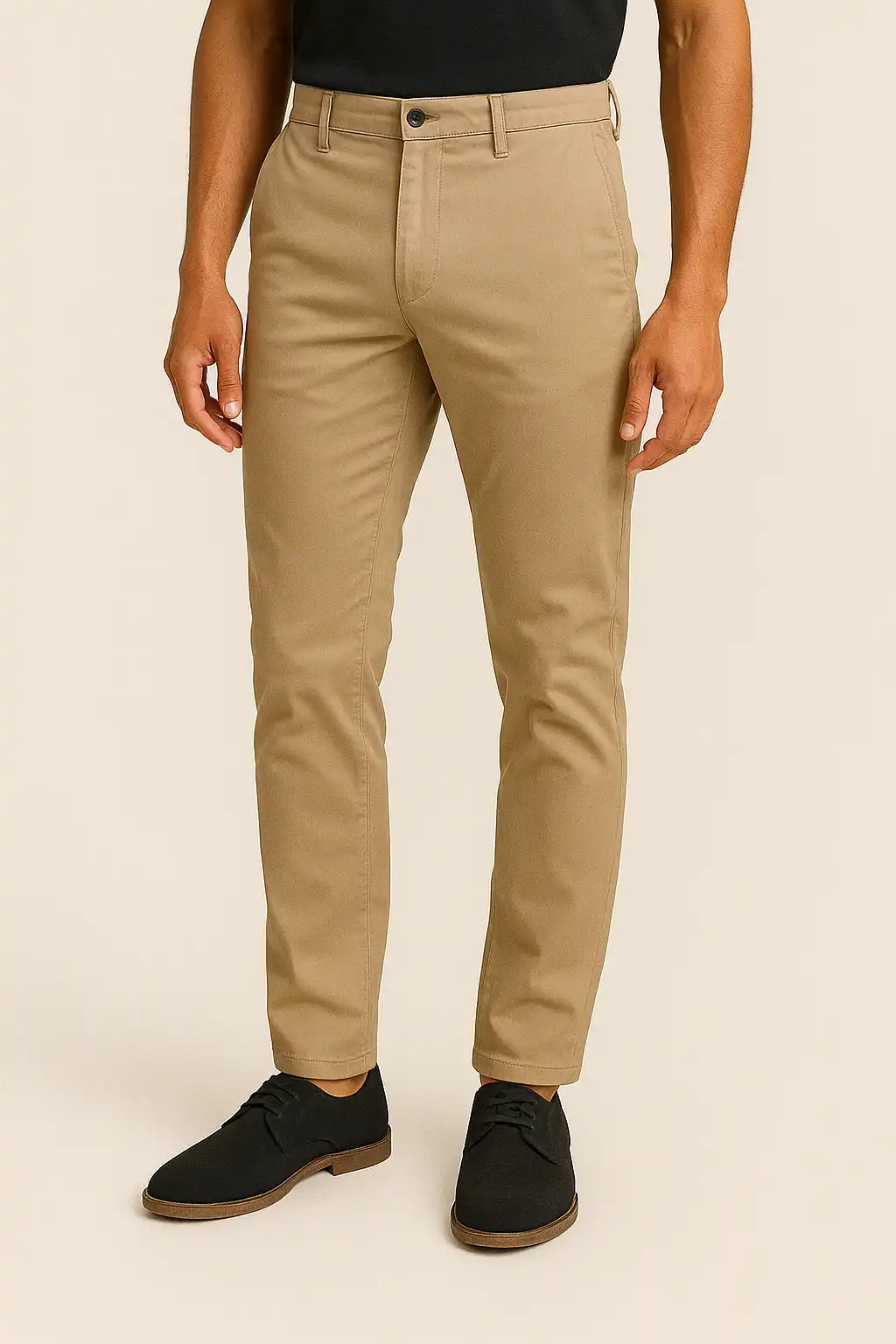 Modern slim-fit chinos in stretch cotton—versatile for casual or dressy wear.